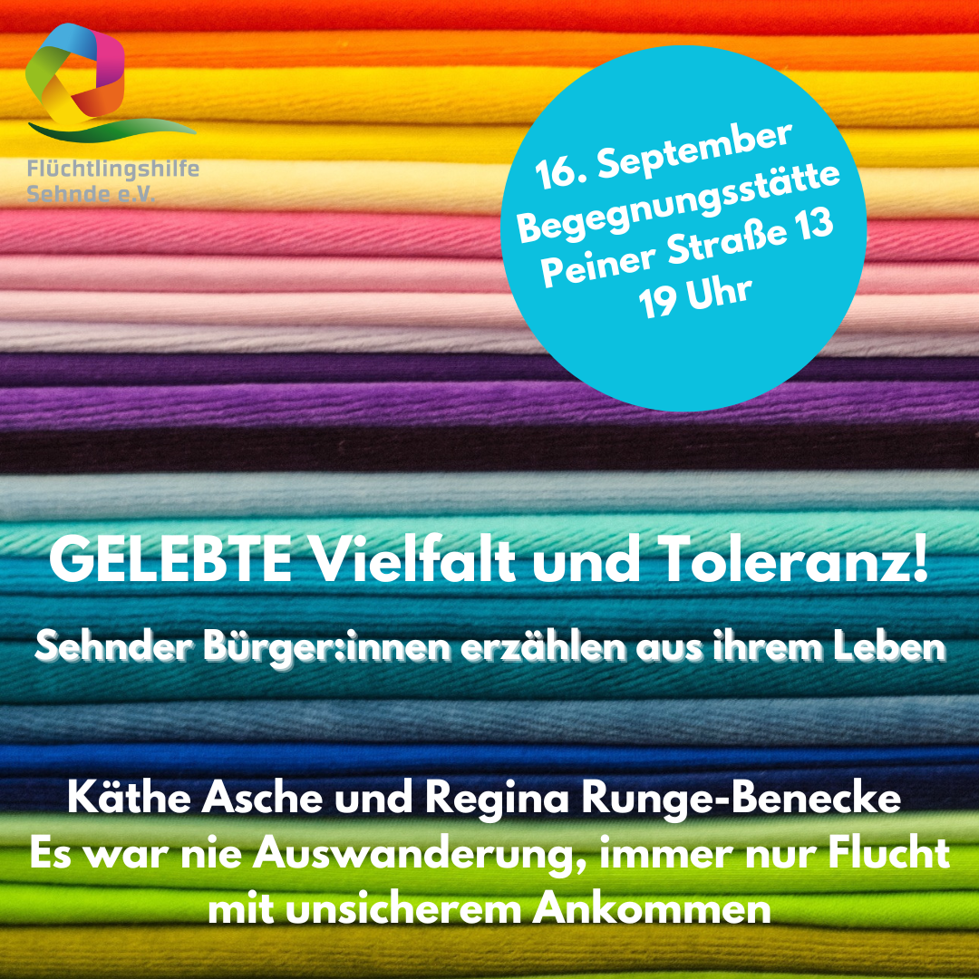 Wir laden ein zu unserer Veranstaltung "Gelebte Vielfalt und Toleranz - Sehnder Bürger:Innen erzählen aus ihrem Leben" am 16. September 2025 in die Begegnungsstätte Sehnde. Um 19 Uhr erzählt Käthe Asche über ihren Weg nach Sehnde und das Ankommen. Regina Runge-Benecke berichtet von ihren vielen Recherchen von Flucht und Vertreibung zwischen 1933 und 1950. Was war anders - was ist gleich?