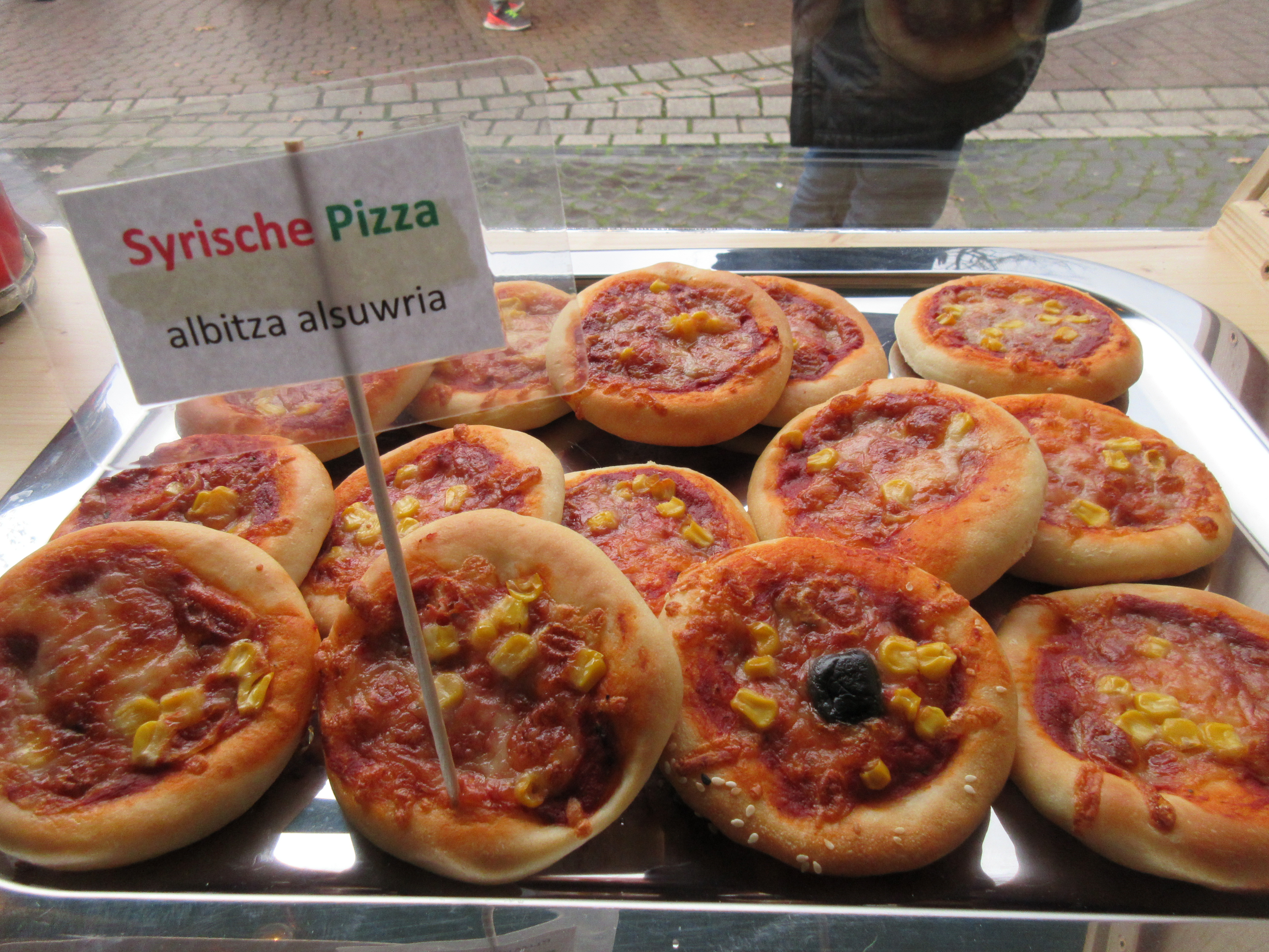Diese tolle Auslage setzte die Speisen auch erst so richtig in Szene. Wir bedanken uns bei Mama Zeynab für die Sambusa nach somalischen Rezept, Nihal für die syrische Pizza, Ravi für die afghanische Samosa. Ca. 150 Stück wurden gegen Spende abgegeben und fütterten das Spendenschwein mit 234,85 €. Vielen Dank allen Spendern dafür!