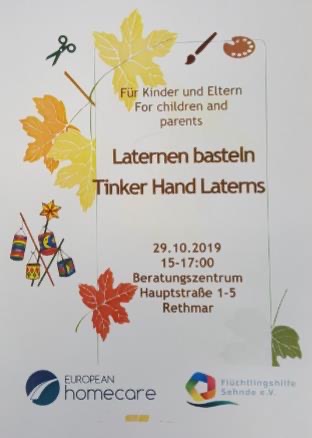In Kooperation mit European Homecare und der Flüchtlingshilfe Sehnde e.V. findet im Beratungszentrum in Rethmar ein Laternen basteln am 29.Oktober 2019 statt. Kinder und Eltern basteln hier gemeinsam die Laternen.